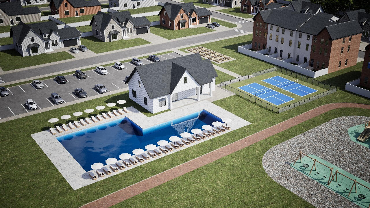 At the center of the community, a private amenity campus enhances daily life. A resort-style pool offers space to unwind, while a refined clubhouse hosts gatherings and events. A private fitness studio and tournament-quality pickleball courts promote active living, and generous green space, walking trails, a playground, and a dog park encourage connection to the outdoors.